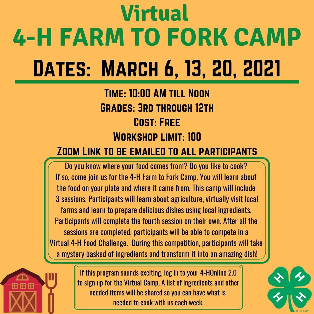Collapse ▲Interested in cooking? Growing your own food to cook? This may be the virtual camp for you! Students in 3rd-12th grade are invited to a 3 part series from 10–11 a.m. on March 6, 13, & 20, 2021. Cost is FREE. Login to 4-H Online and click on events to register.