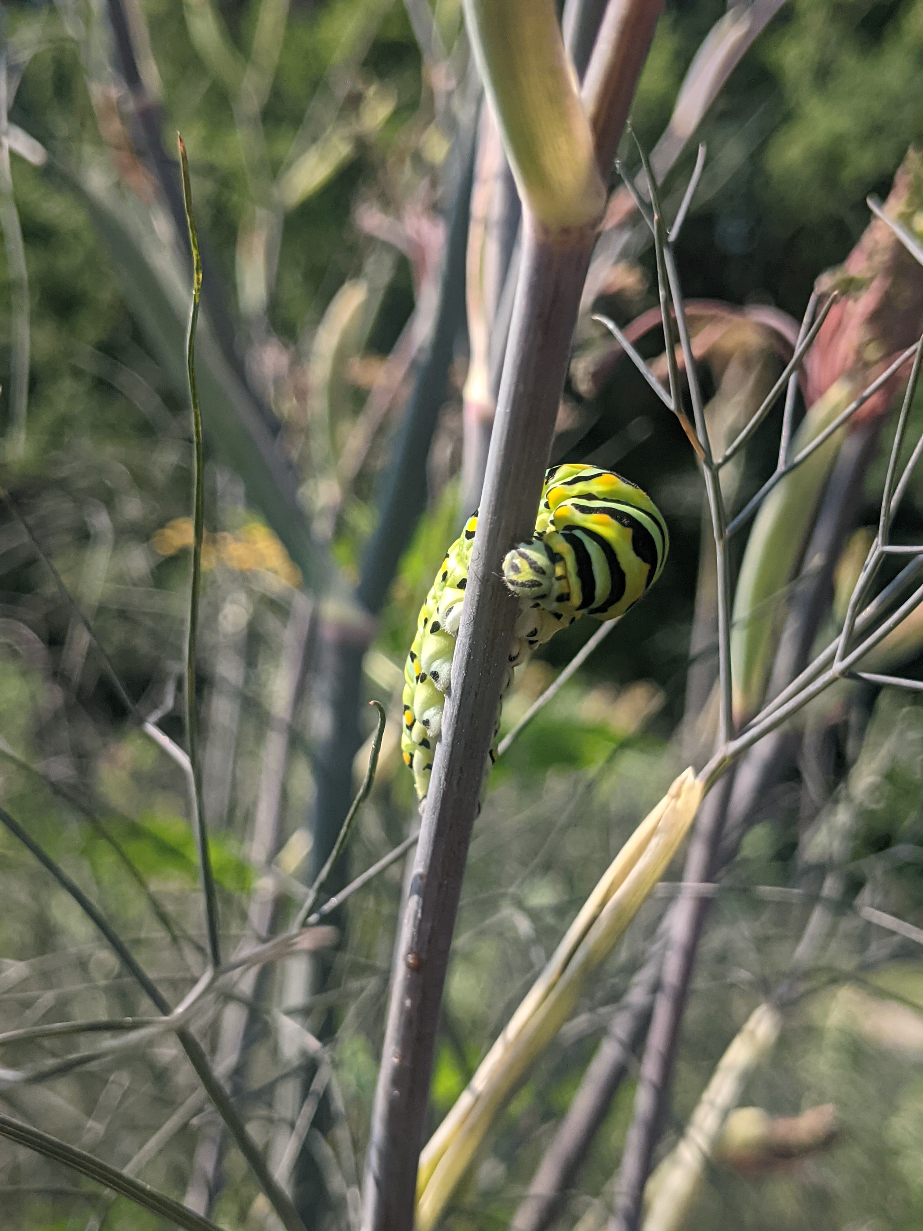 This insect appears to be a worm of some type. The first question to ask is what the unidentified garden guest is eating, and how it is feeding. Investigating further, we know that this worm is feeding on anise by slowly munching the leaves. There do not appear to be many of the worms, so we conclude that this case is limited or isolated. Finally, we recognize this insect is not actually a worm - but an immature butterfly, also known as a caterpillar. Specifically, we checked our insect book and found this animal to be a black swallowtail caterpillar. It is best left alone, as we now know the species does little damage and is a beneficial pollinator.