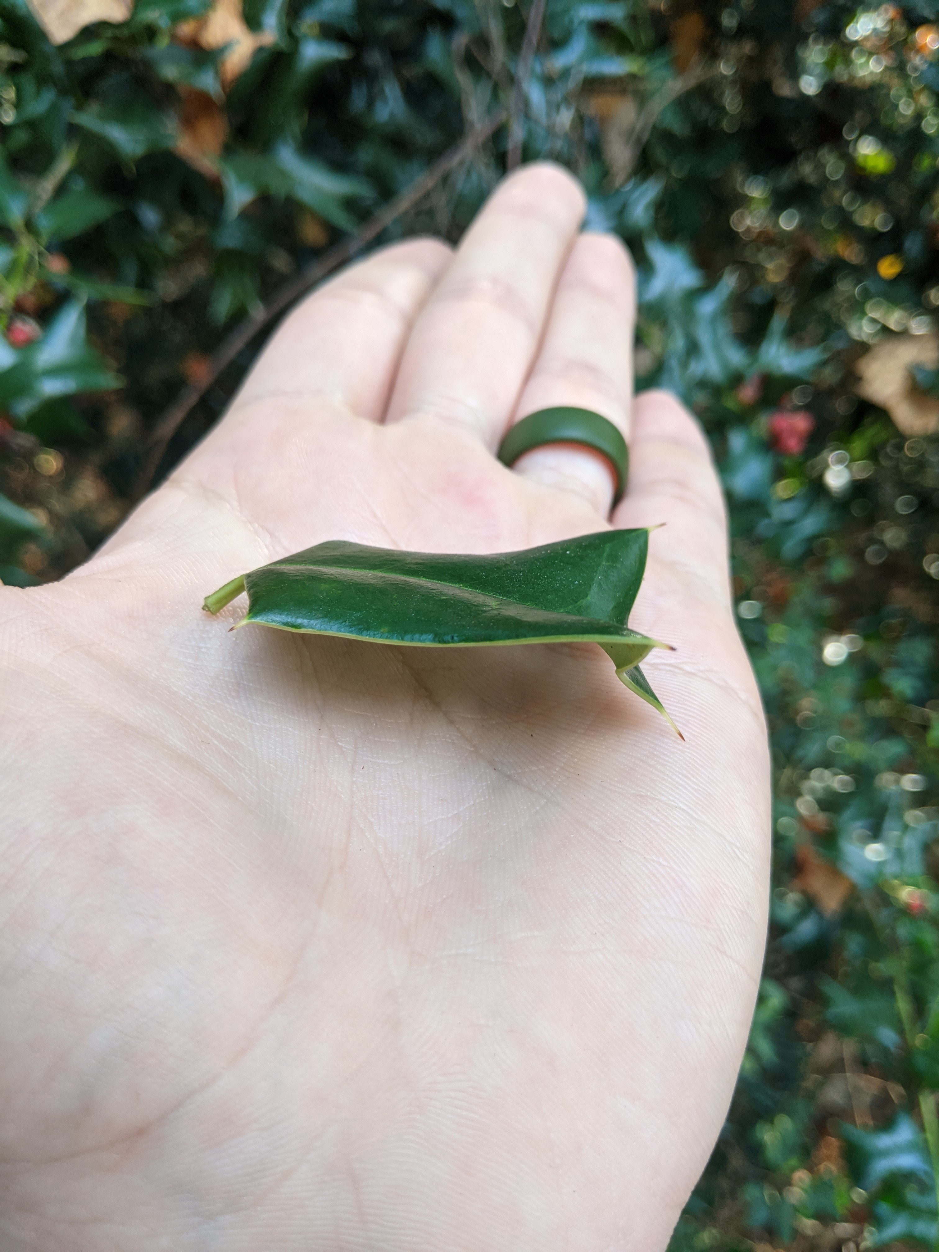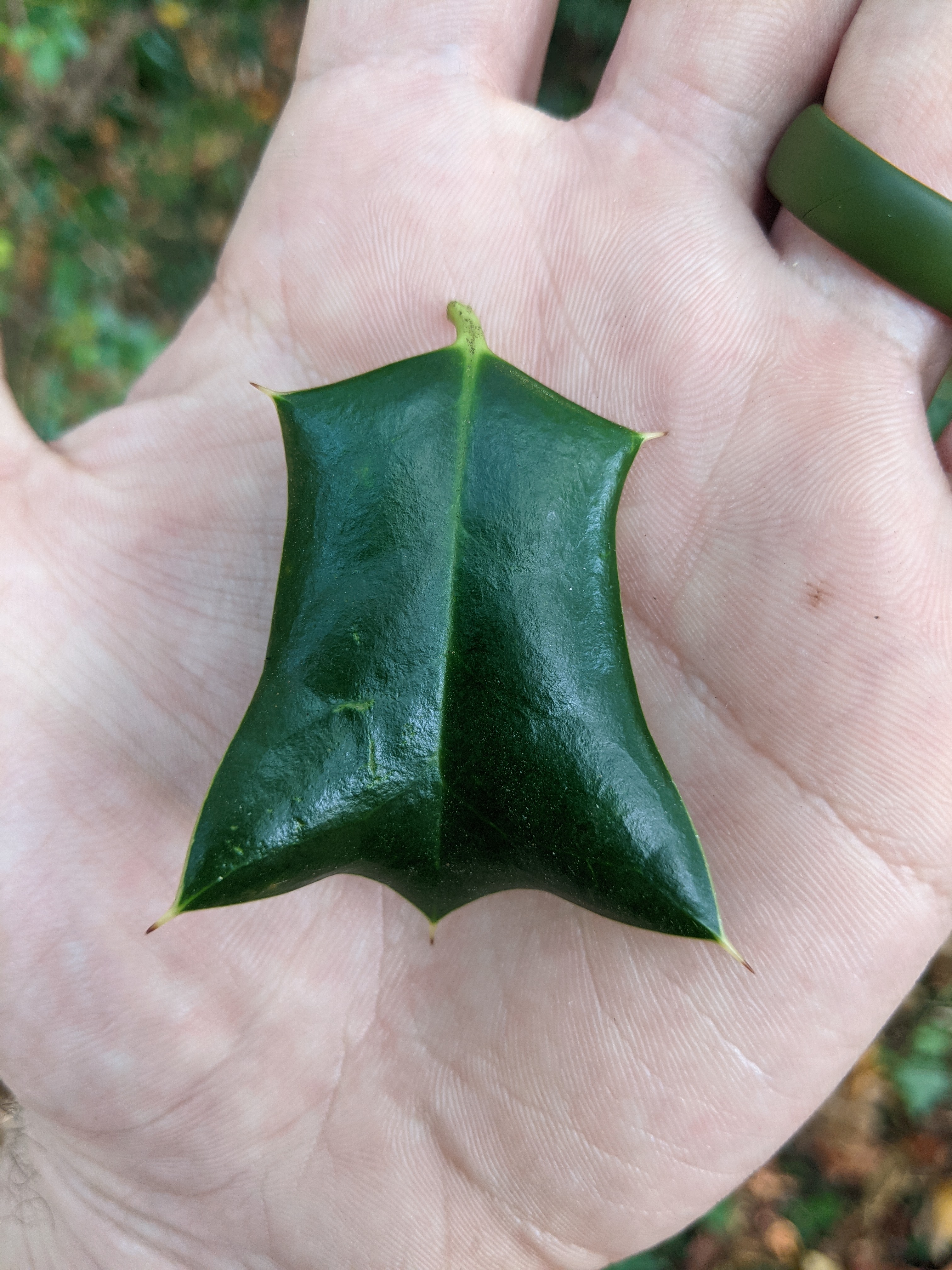The horned holly, Ilex cornuta. This specimen can be found throughout Troy. Walking the neighborhoods, you can find hollies this time of year by their red berries and evergreen leaves. Watch out for spiky leaves!