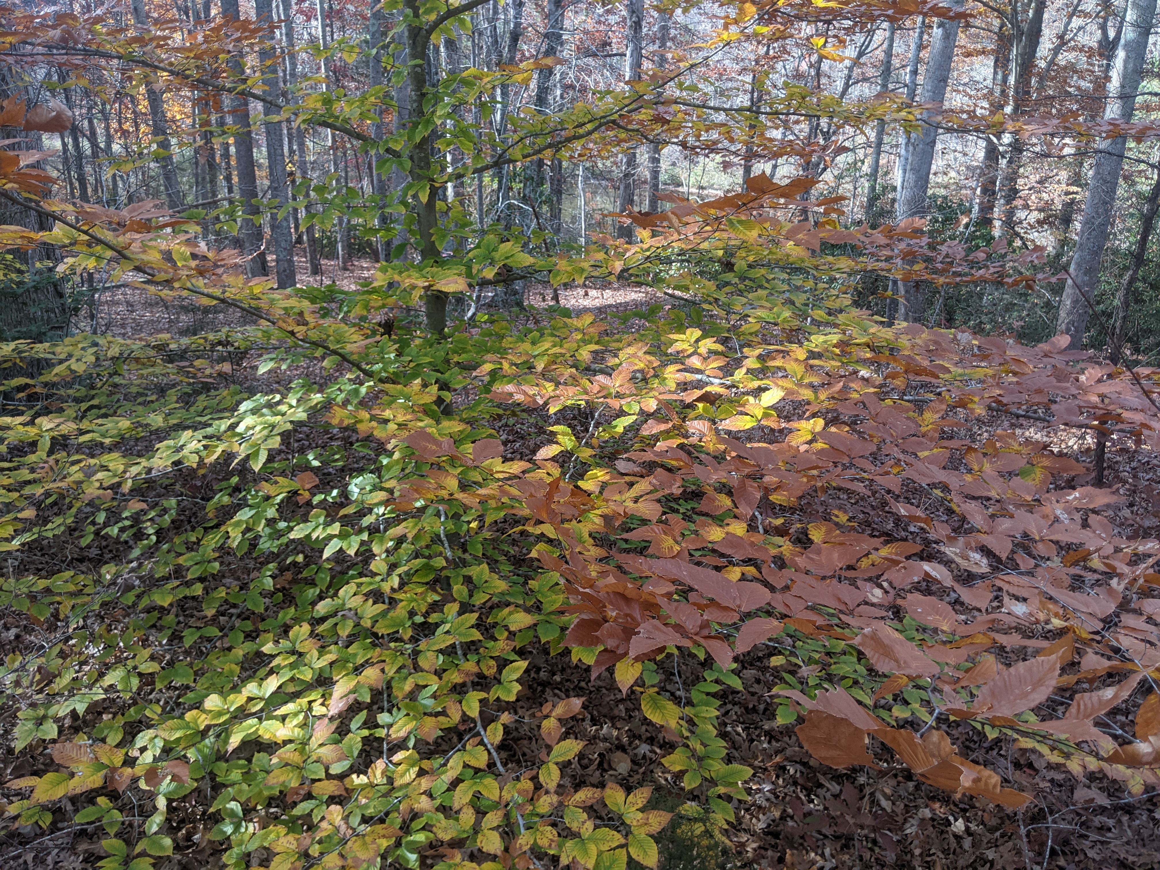 Colorful American beech tree, Fagus grandifolia. Leaves come on green in the spring, and turn yellow then red-bronze in the fall.
