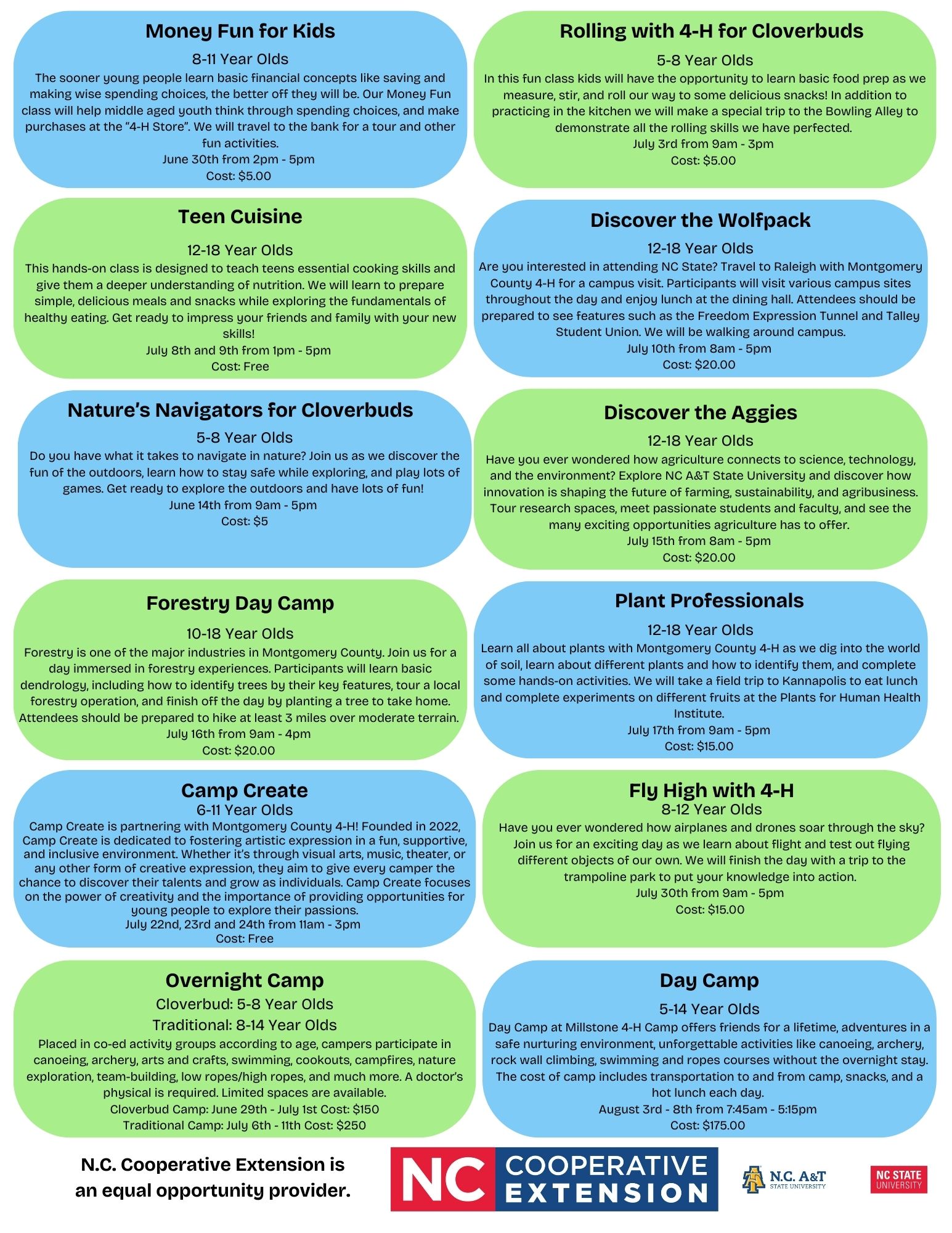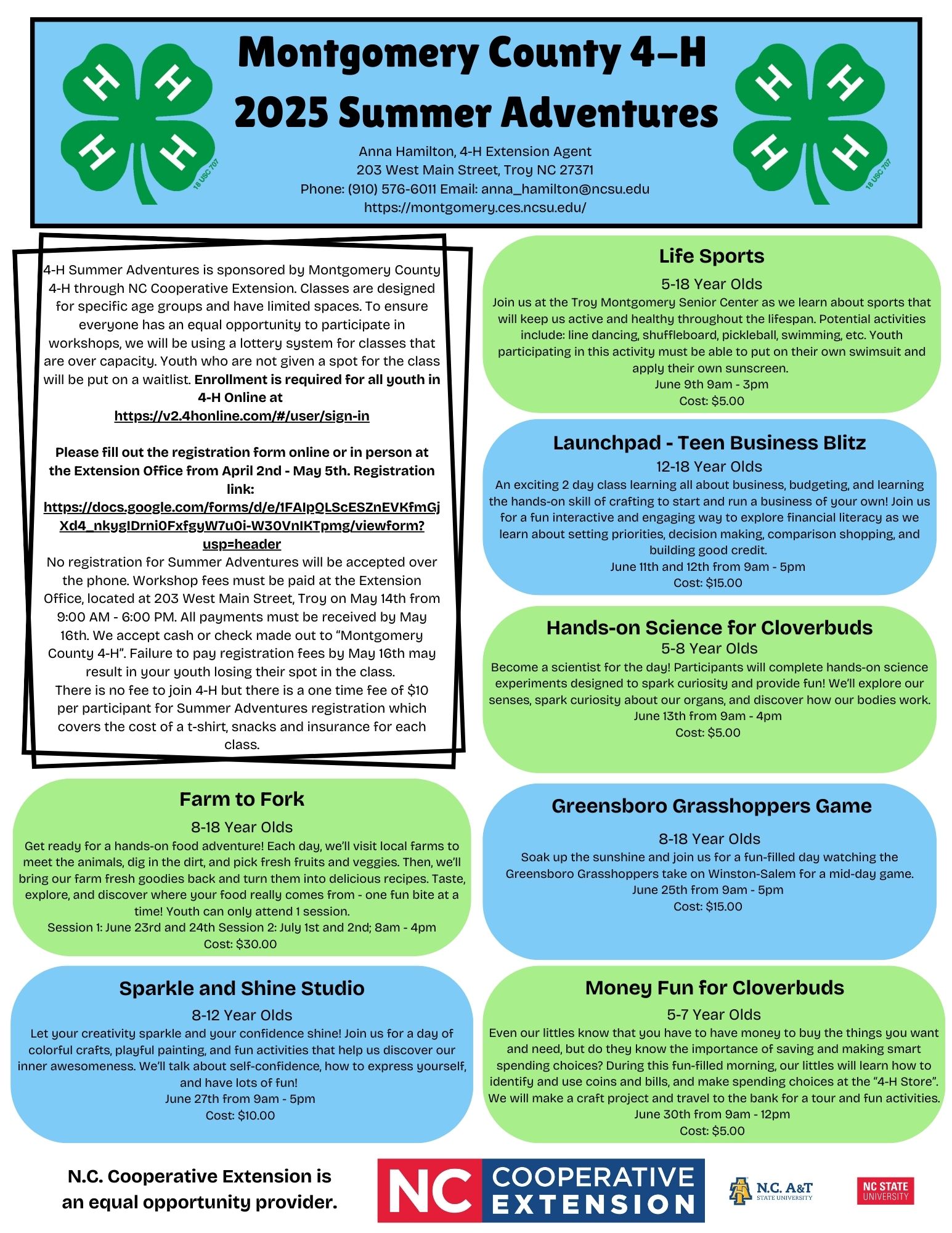 It is time to register for Montgomery County 4-H 2025 Summer Adventures! Registration will be open from now until May 5th. Parents will be notified via email of which classes their youth can attend after May 5th. Workshop fees will be due May 16th.
